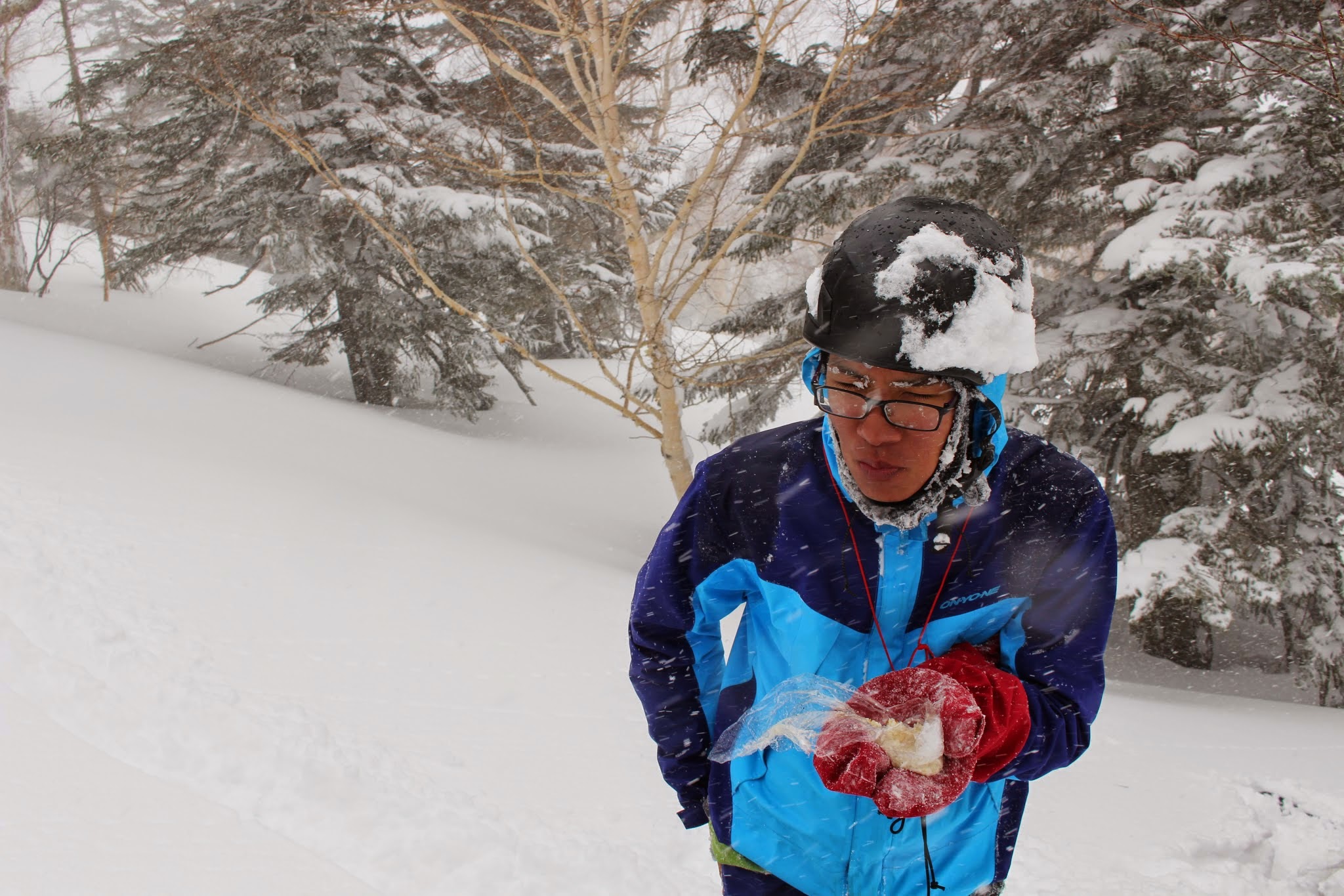 1650m付近まで下り、雪洞を掘る。新雪+ザラメでもうめちゃくちゃかと思いきや、がちがちの雪に突き当たる。