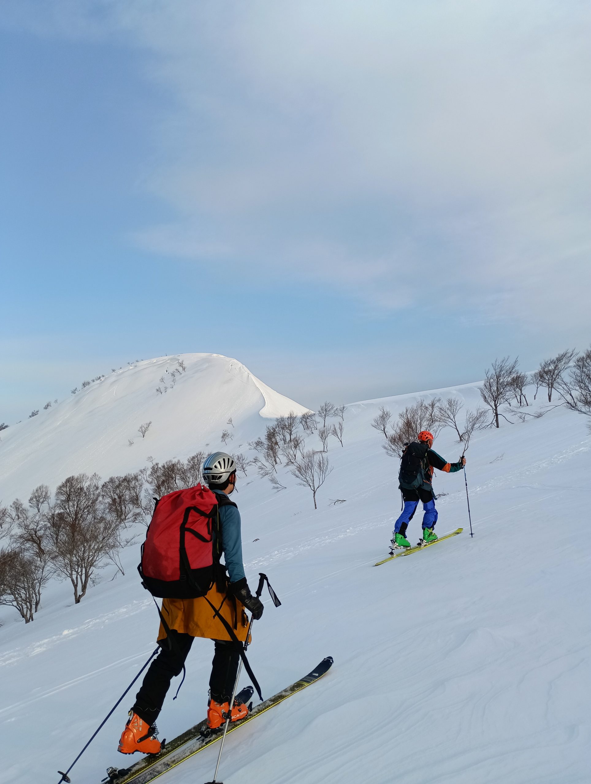 くもり予報にあまり期待せず登山口の集落に行ったら、抜けた青空だった。予報会社の悪口に花を咲かせつつ、春の汚い雪の上を歩いていく。標高1000mの尾根に乗る場所では、樹林帯にも関わらず高さ6mほどの雪庇ができていた。局所的な風の影響は本当に恐ろしい。尾根上ではその後も雪庇があったりなかったりの状況が続いた。標高を上げていくと山形盆地を取り囲む山々が顔を出してきた。一等目を引くのは月山だ。料理に使うボウルを伏せたような平和な、しかし巨きな山体を見せている。反対側に目を向ければ陸羽国境の山並みがある。北に船形、その南に大東なぞの山塊があって高くなったところが蔵王だろう。さらにひと登りすると樹間が開け、今度は朝日岳が未だ白い嶺を連ねているのが目立つようになった。左の高いのが大朝日岳で右に離れて独り立っているのが以東岳だと言うと、トウカさんは夏に流れた八久和川へのリベンジを決意しているようだった。小僧森(1407)の直下まではスキーで行った。しかし目の前の稜線はなかなか細く、両側斜面にグライドクラックも開いていたので、ここからはシートラすることにした。小僧森直下で一跨ぎできるほどではあったが、深いクラックを越える場所があって、多少緊張した。以降はスキーでも歩いて行けそうだったが、雪が締まっていて歩き易い上、スキーを履きなおすのが面倒だということで稜線はずっと歩いて行った。山頂に着いたのは7時40分、素晴らしい朝活になった。滑走も順調だった。みるみる標高を落として行き、今年の多雪のおかげで、懸念していた渡渉にも全く問題はなかった。しかしその後の登り返しでひと騒動あった。日差しと高温のせいで雪が融け、板とシールが水浸しになってしまい、シールが接着しない。結局シールが剝がれたまま歩いたり、傾斜のついたところではシートラしたりでなんとか登っていったが、春スキーでのシール浸水は侮れない問題だと分かった。板の滑走面を拭くための雑巾を持って行ったほうがよかっただろう。下山完了は10時半。あまりにあたたかい好い天気だったので、駐車場でしばらく昼寝して帰った。