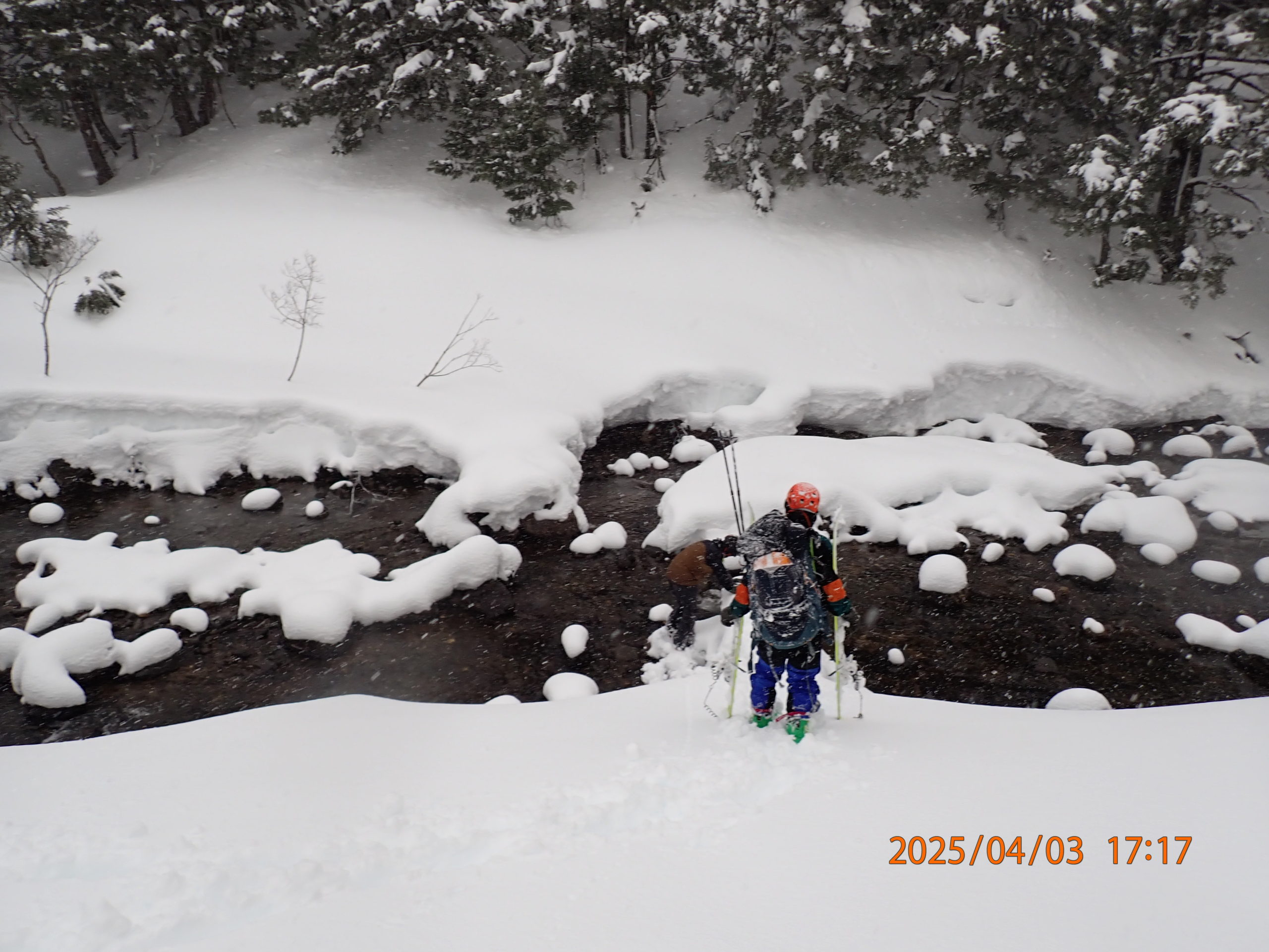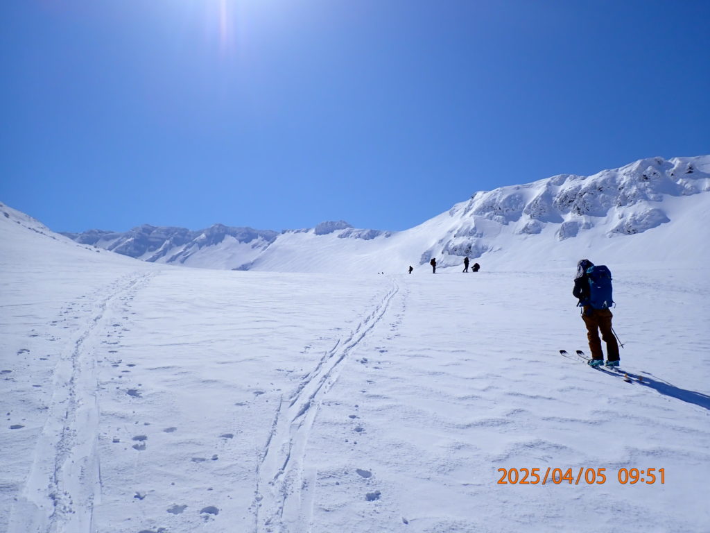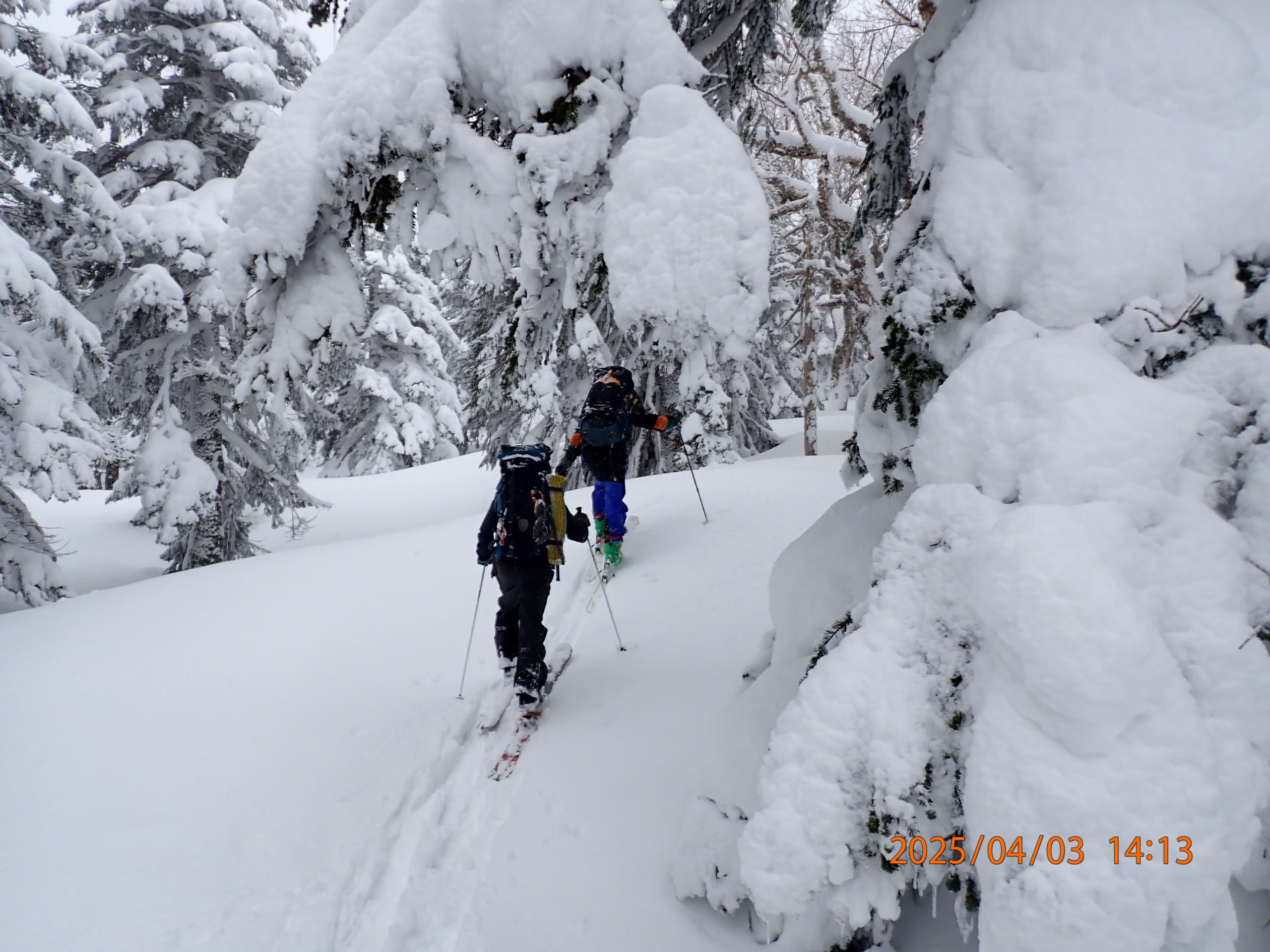 滑走は本当に早かった。雪質は極上で、適度な重さと反発を持っていた。何をしてもこける気がしなかった。下部は雪重く、斜度緩く、滑走には難儀したが、必死に漕いで最後まで滑り切った。なんと下山はトータル1時間30分!!スキーのアドバンテージを思い知った。