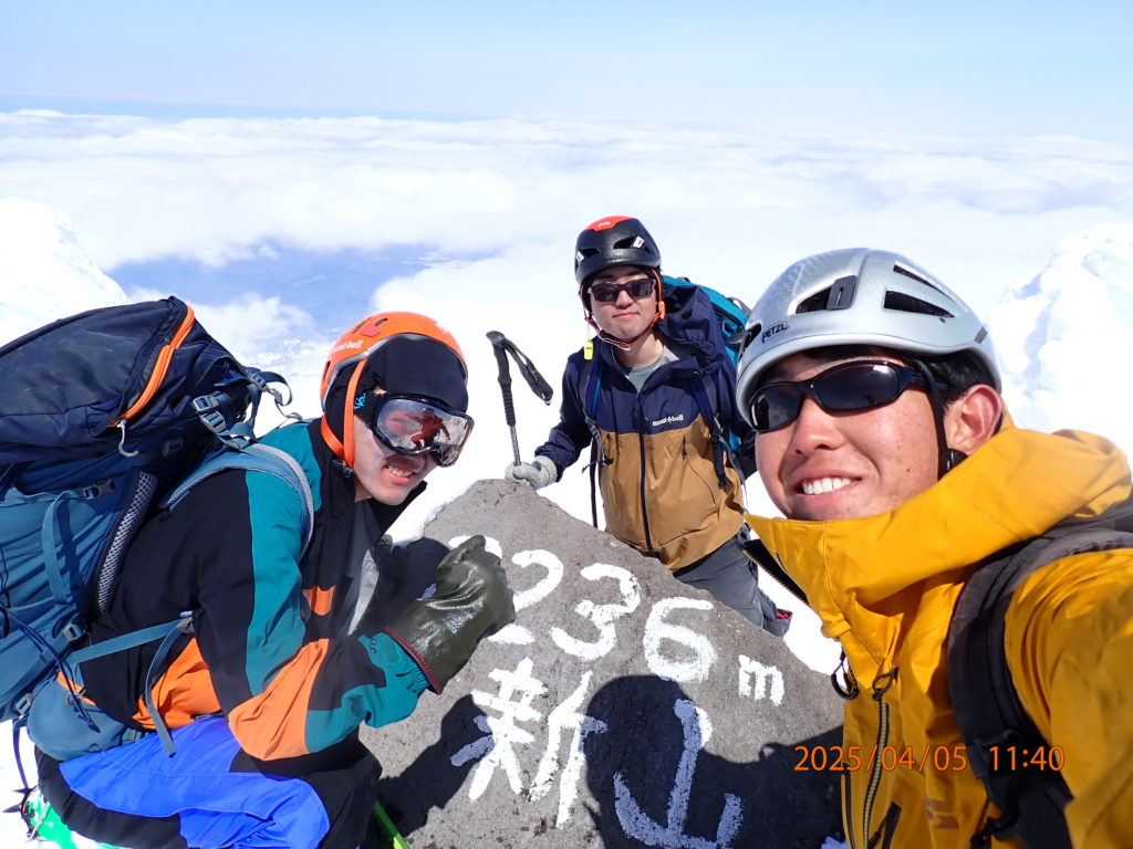 前日までの吾妻縦走からの疲労を考えて、出発を少し遅らせることに。駐車場で仮眠をしていたら、後から車が来るわ来るわ。下山時に見たところでは50台もいたかもしれない。鳥海山までの途は長い。登山口は450mで山頂は2236m、加えて下部では傾斜がかなり緩く、水平距離では10kmを超える。登山開始して2時間は標高をだらだらと上げていく。風がなく、かなり暑い。標高1000m辺りで鳥越川を渡渉するが、雪で埋まっていて全く問題はない。さらに距離を稼いでいく。日本海が近いからだろうか、標高1200mで早くも森林限界を越え、純白の斜面の上に、眼前の新山が存在感を発揮する。斜度が増してきて、今度は標高を稼ぐ。1800m辺りで雲の上に出ると、快晴無風のパーフェクトコンディション。半袖でも暑いような日差しが春を感じさせる。いよいよ暑くなってきた11時、標高2200mの大物忌神社に着いた。ここからは斜度が付いたので、スキーをデポして山頂を取りにいった。白雲の上を進む洋上艦のような鳥海山がそこにあった。ここより高い場所は、視界のどこにも見つけられなかった。