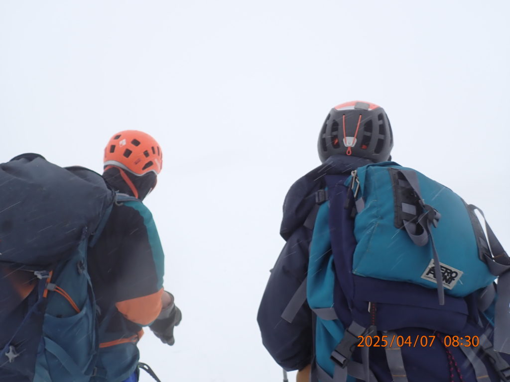 京都から700kmを夜間行軍にて突貫し、小雨降る中予定通りの8時にはスキー場に着いた。リフトで標高1600mまで上がると、降水は雪転しており、森は真っ白になっていた。視界がないのはなんだかなと思いつつ、ひと登りするともう西大巓だ。予想通り尾根はだだ広く、地形の特徴に乏しい、以降中吾妻山までずっとコンパスを切って進んだ。シュカブラに苦労しながら1時間も歩けば西吾妻に着いた。特に山頂という感は無いが、最高峰ということで記念撮影。山頂では流石に風が冷たかった。北に少し進んだ梵天岩からは、中大巓を巻いていこうということでトラバースに入ったが、トラバース始めてすぐのさほど急ではない場所で先頭を歩いていたJamesが斜面中に何故か形成されていた雪庇を抜いて転落した。当時は雲が厚くて光量が足りず、地形の起伏が全く見えなかった。てっきりシュカブラかと思って踏み込むと、地面がなかった。