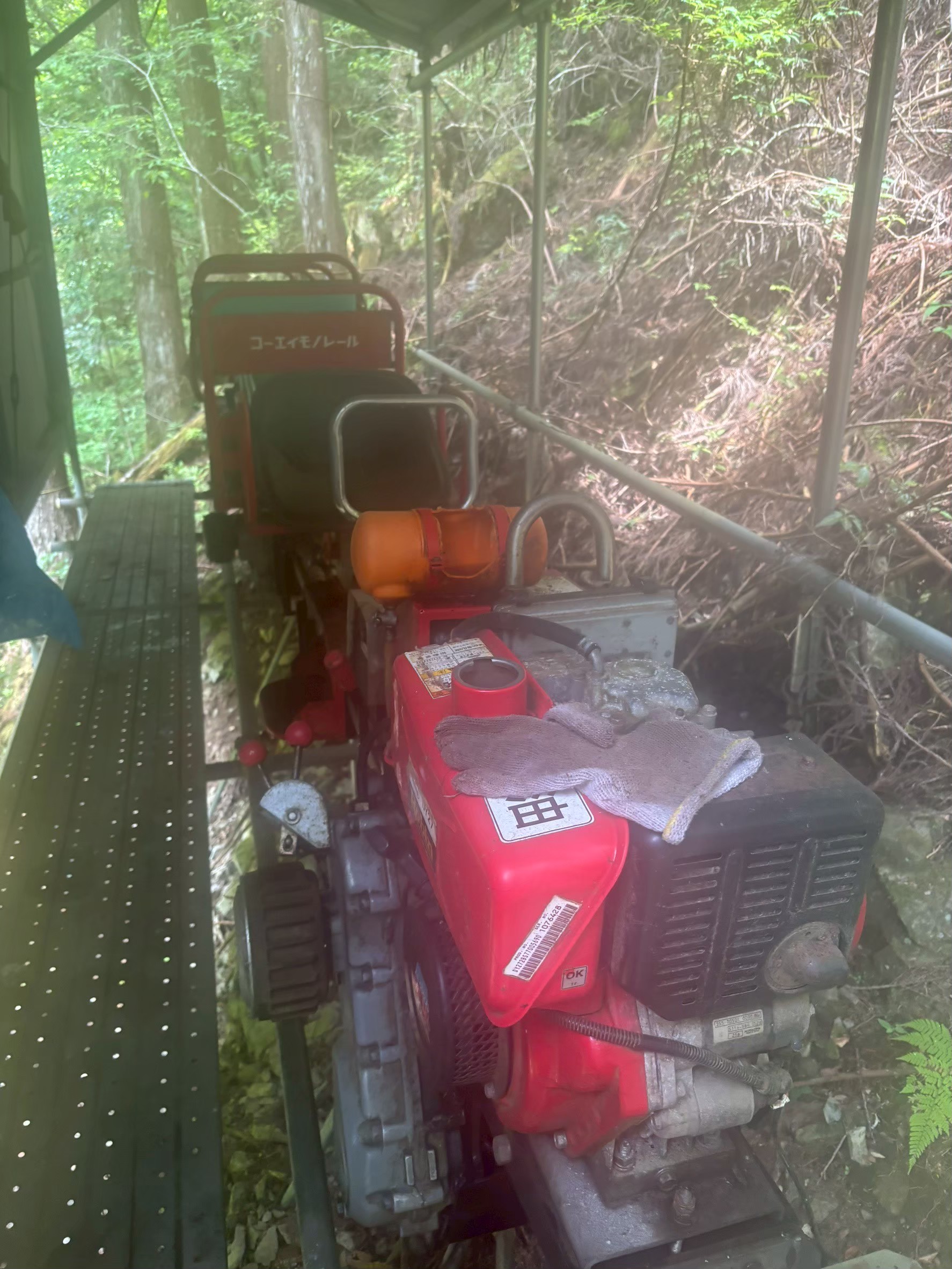 抜けるとすぐに堰堤跡が見える。尾根上に残る踏み跡を辿って斜面を上がるとモノレールの線路がある。記録にあるように手すりがわりに下りると東屋近くの遊歩道に出る。モノレールの格納庫もあって現役で使われているようだった。
