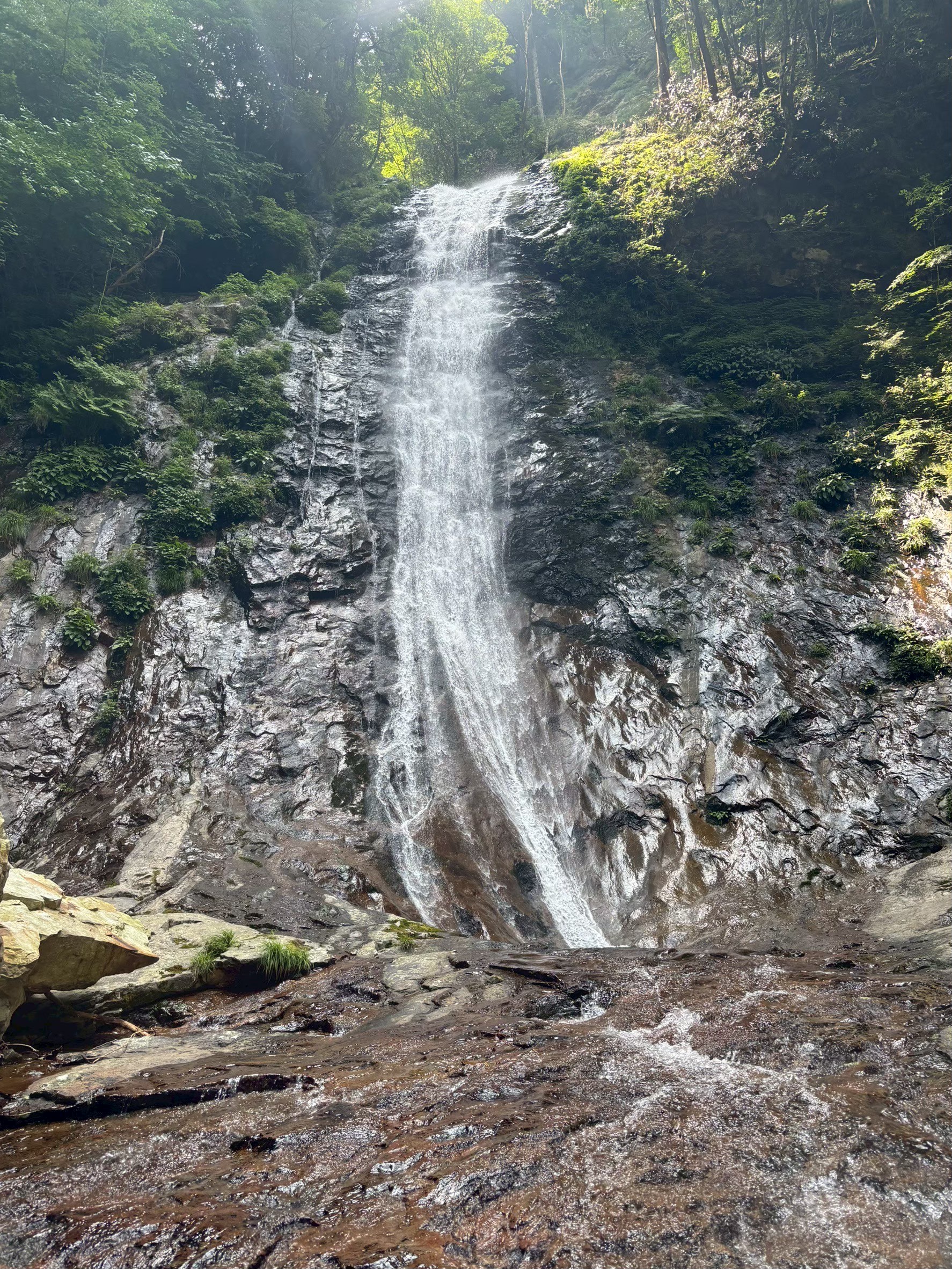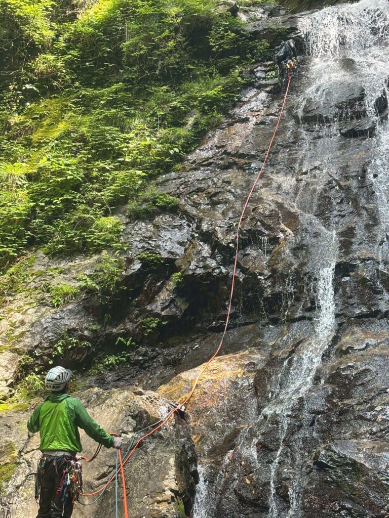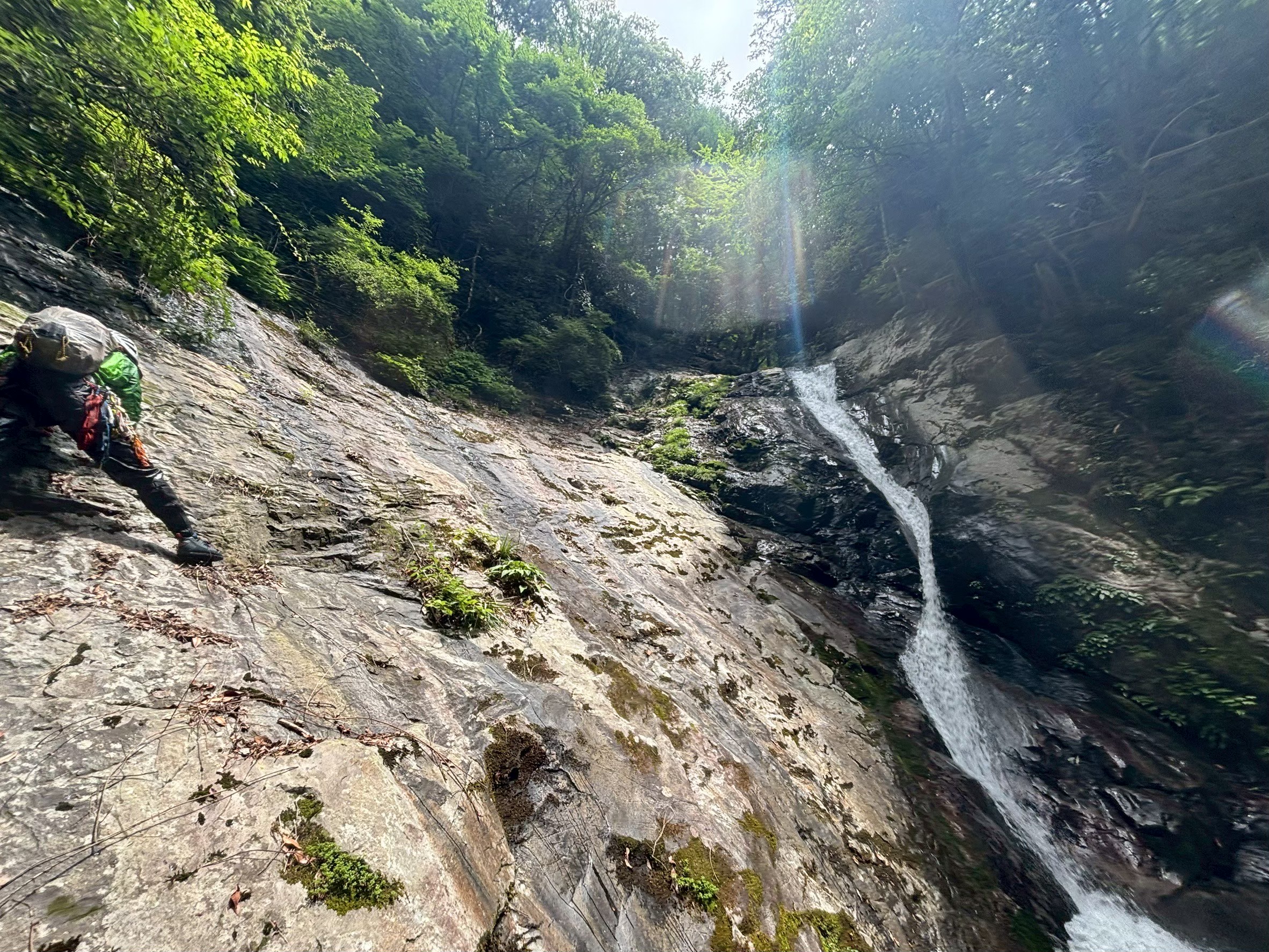 のんびり出発し、東屋から10秒もたたず泳ぎが始まる。F1,F2はノーザイルで越えてF3判決リード。水線近くは滑りのある面ツルで支点も得づらくフリーでは難しそう。右壁をフリーで越えることにする。2回ほどあるマントル返しのムーブはジムでの練習が活きる。途中トラバースする必要があるがフリーでは不安だったので、エイド。全体的にリスが浅く、決まりはするものの1、2センチ程度。タイオフして抜けると後は落ち口までフリーで抜けられた。判決の不手際でバイデンに新たに支点を作ってもらったため時間がかかったが、探せばリスはあるので予想より楽に突破できた。その後の滝はノーザイルで大滝まで。