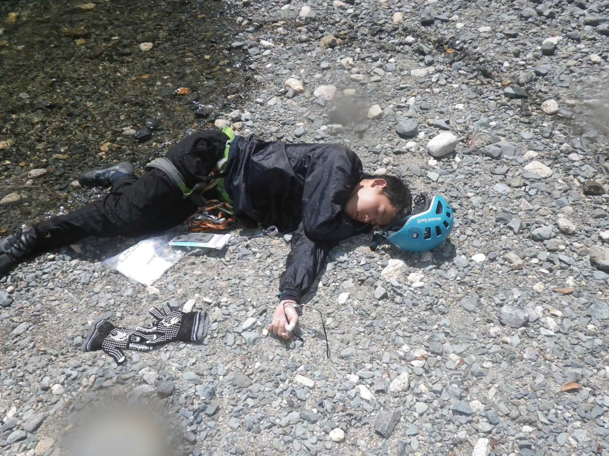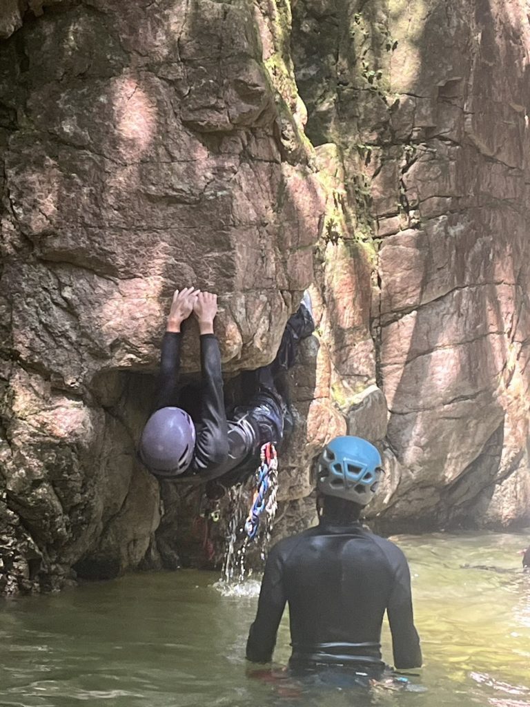 天然の水をマット代わりにクライミングするDTさん